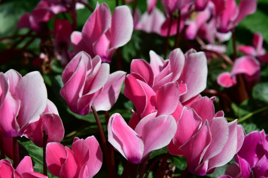 冬の寄せ植えに重宝するガーデンシクラメンは、レッドやピンクの花色が楽しめる多年草。近年はレッドやピンクでも、明度の異なる色合いの品種が登場しています。