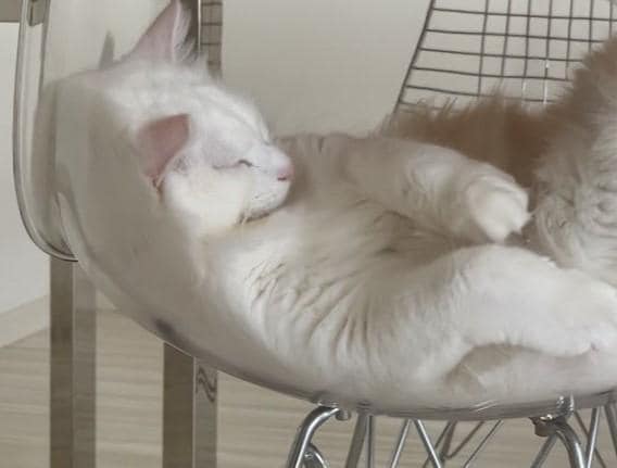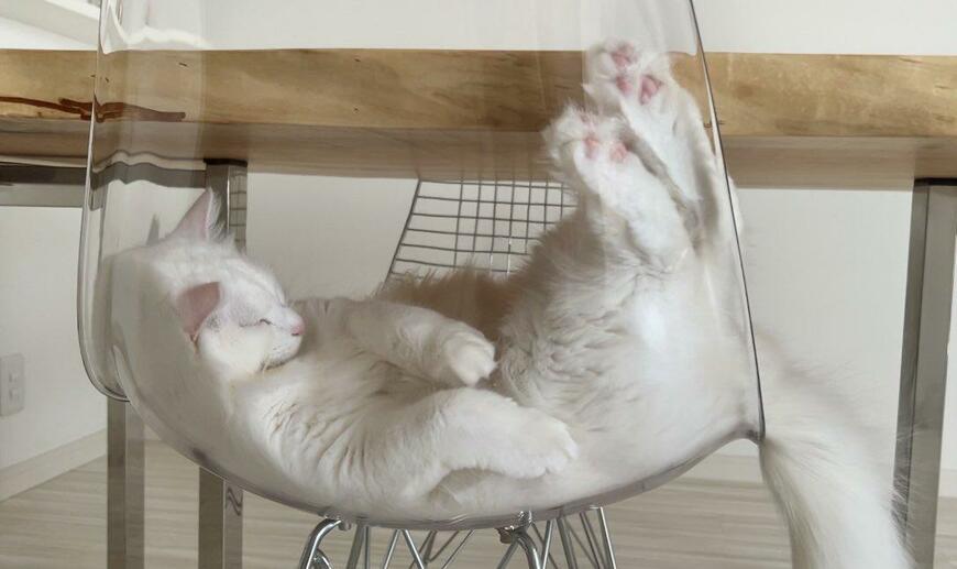 話題になっているのは、白猫の男の子「マオ」くん。透明の椅子にジャストフィットといった具合で身体をおさめ、スヤスヤと眠っているようです。
