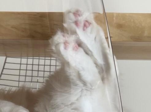 さらに足先をよく見てみると、イスにピタッと密着した肉球が丸見えです。きれいなピンク色をした肉球が白毛から覗く光景は、ずっと眺めていたくなるほど魅力的……!