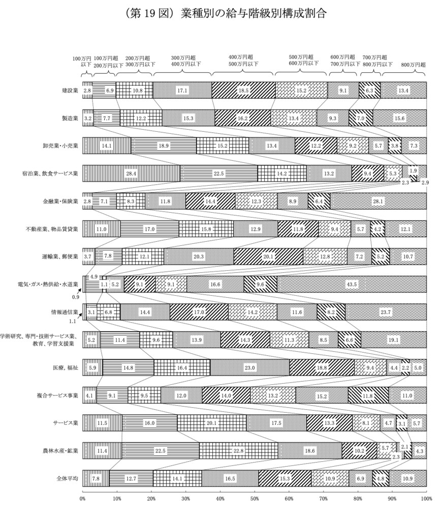 一方で、「宿泊業・飲食サービス業」は平均給与が最も低くなっており、年収100万円以下の人が28.4%と最も多くなっています。