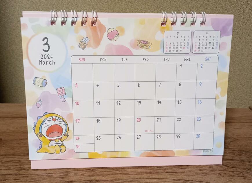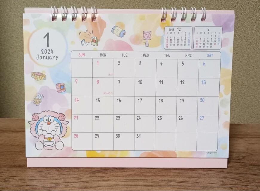 ダイソーでは2024年のカレンダーが販売されています。2023年10月には、写真のような「ドラえもんの卓上カレンダー」が販売されているのを発見しました。