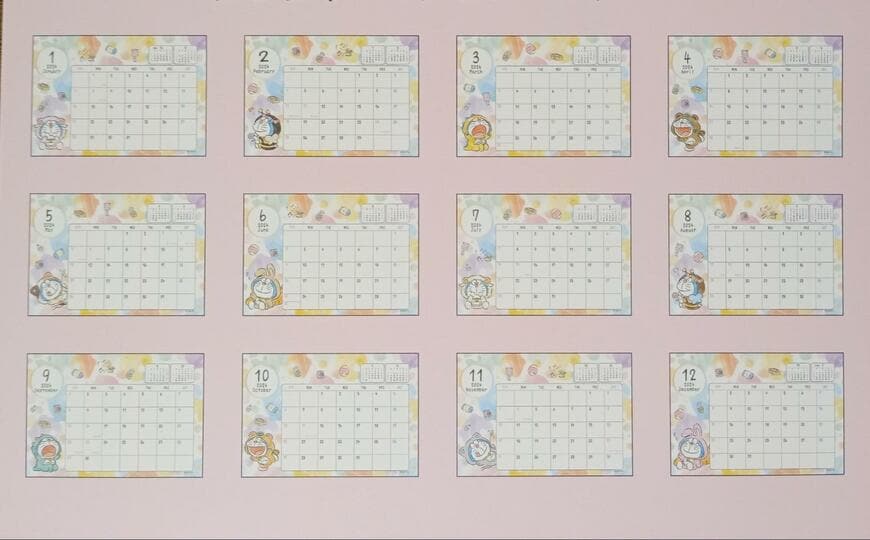 12か月分のイラストは写真の通りです。リラックスした雰囲気のドラえもんがかわいらしいです。
