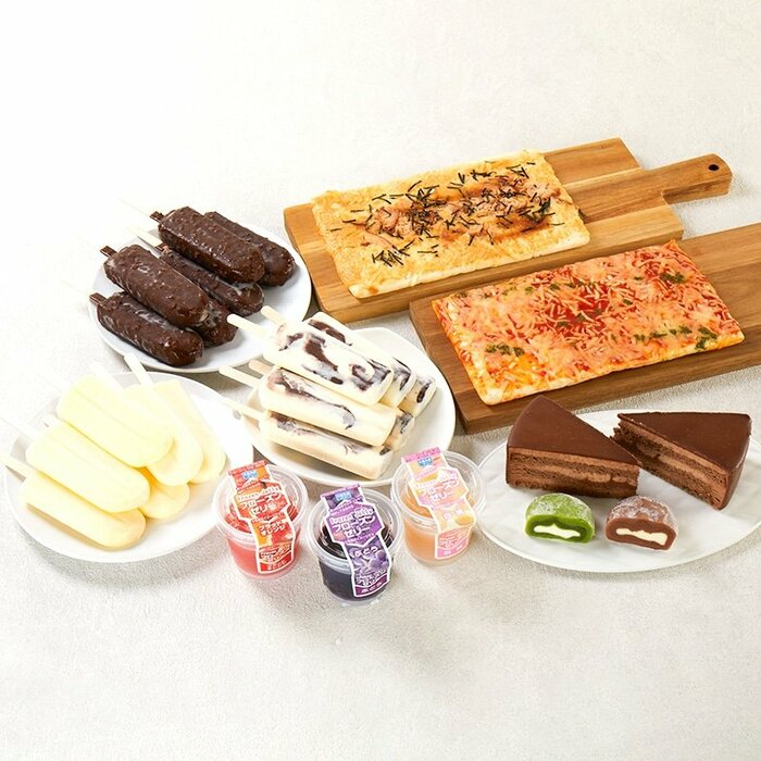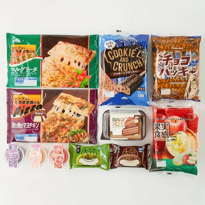 - 詰合せ内容:果実食感バーふじりんご6本入×1袋、チョコバッキーバニラ 6本入×1袋、クッキー&クランチバーチョコ 6本入×1袋、オーブンでそのまま焼けるピザ マルゲリータ×1袋、オーブンでそのまま焼けるピザ 照り焼きマヨチキン×1袋、ホイップクリーム大福 苺×1個、ホイップクリーム大福 チョコ×1個、糖質86%カットの濃厚チョコショートケーキ 2個入り×1個、フローズンゼリーぶどう×1個、フローズンゼリー白桃×1個、フローズンゼリーブラッドオレンジ×1個