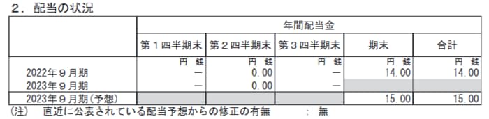 - 2023年9月期の期末配当(予想):15円