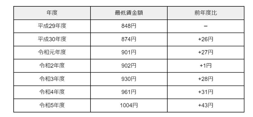 これまで、最低賃金は年度ごとに徐々に増額されてきましたが、2023年10月からは1000円台に突入し全国平均で1004円となります。