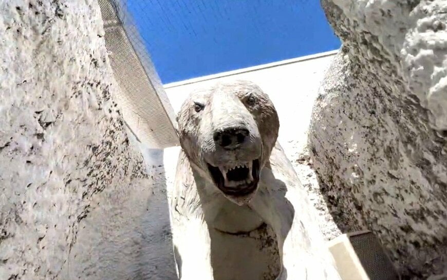 狭い入口をかがんで進んでいくと、上に大きな空間が出現しました。立ち上がって周りを見渡してみると、今にもこちらに飛びかかってきそうなホッキョクグマとご対面…!