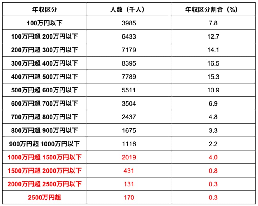 とはいえ、それでもなお約20人に1人しか、年収1000万円超に到達できていないことがわかります。
