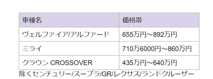 その結果、ミニバンの最高峰である「ヴェルファイア/アルファード」、FCV(水素自動車)の「ミライ」、世界中で愛される大型オフローダーの「ランドクルーザー」、そしてお馴染みの「クラウン」などがあります。