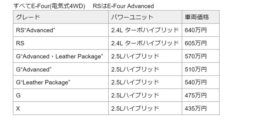 また、RS系は21インチ、その他は19インチという大径タイヤと、雪路などの滑りやすい路面で、スムーズに4WD状態へ切り替えることで、発進性、走行安定性を賢くアシストするE-Four(電気式4WDシステム)によってまさに全天候型の高級車となっています。