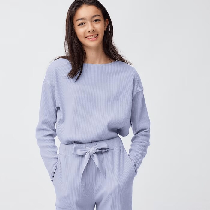 柔らかいリブ素材と可愛らしデザインが目を惹くリブラウンジセットです。着心地が良く首周りが少し広めになっているので、デコルテをキレイに見せてくれますよ。お家の中でも可愛く女性らしさを出したい人にピッタリですね。