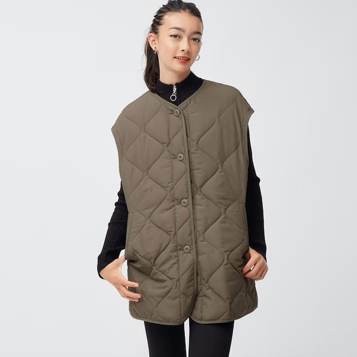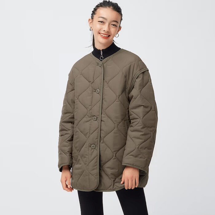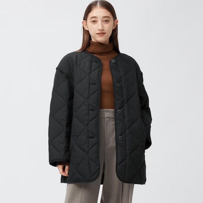袖部分の取り外しができるので、季節に合わせて自由にスタイリングが楽しめます。保温機能付きのミディアム丈なので、冷えやすい腰回りを暖かくしてくれますよ。デザイン、機能性ともに優秀です。