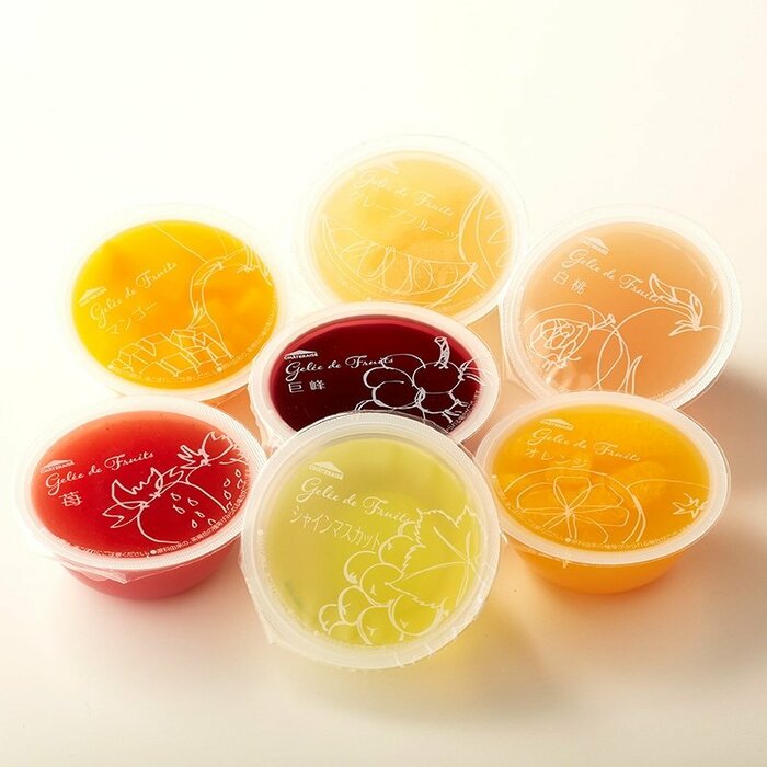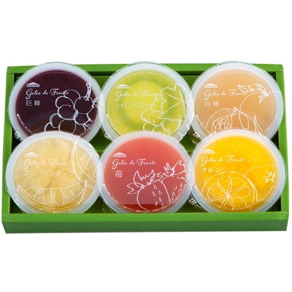 山梨の名水「南アルプス白州名水」と、こだわりの果物の果汁をミックスしたジュレのセットです。オレンジ/グレープフルーツ/巨峰/白桃/苺/シャインマスカットの6種類、1個ずつがセットになっています。