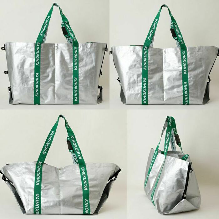 ショッピングだけでなくアウトドアにもおすすめの大きめエコバッグです。サイドについているファスナーの開閉やボタンの留め外し、持ち手のバックルを付け替えることによって7通りもの使い方ができます。