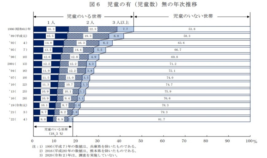 1986年の調査時には子どものいる世帯は全世帯の約46%を占めていましたが、2022年の調査時には18.3%にまで減少しています。子育て世代は年々減少傾向にあるといえるでしょう。