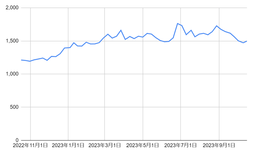 - 1年後の株価の終値:1498円