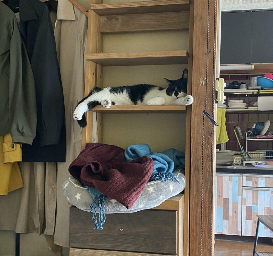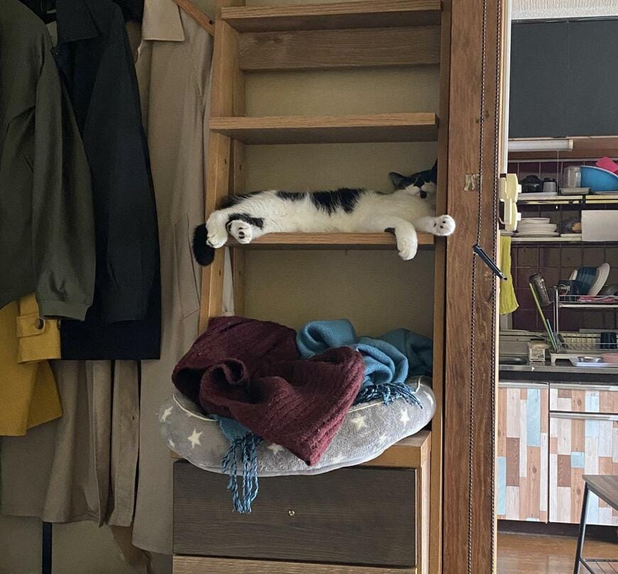 ベッドはすぐ近くにありますが、今は「棚におさまりたい気分」だったのでしょうか。モズクちゃんの絶妙なチョイスに笑みがこぼれてしまいました。