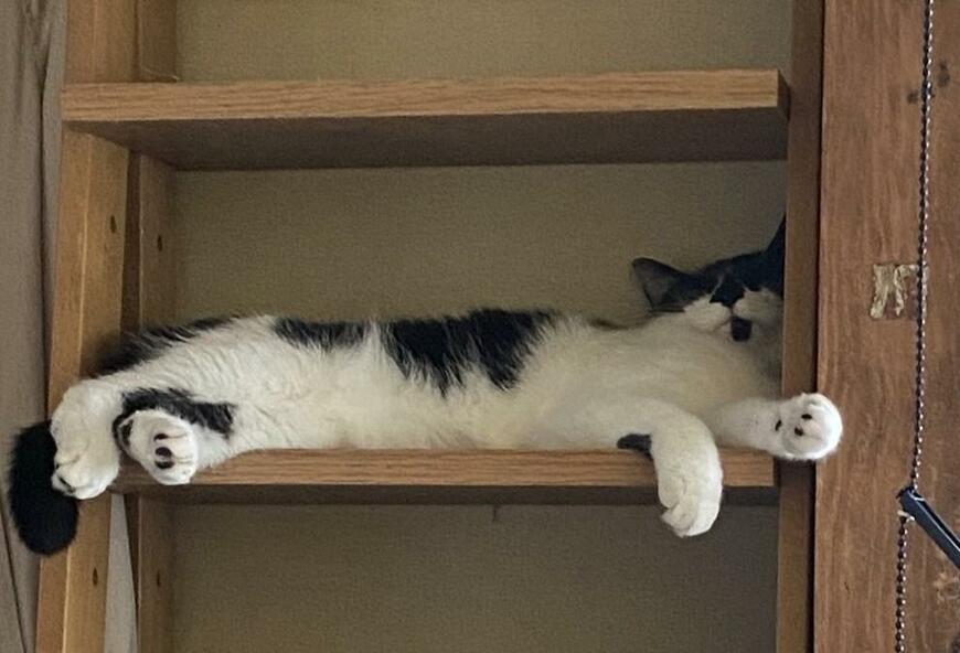 手足をちょこんと投げ出しながら、棚にぴったりと背中をおさめるモズクちゃん。気持ち良さそうな表情からは、満足気なようすが伝わってきますね……!