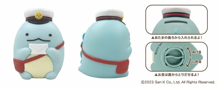 「もりのゆうびんやさん」の配達員風の恰好をしたとかげが、手紙をぎゅっと握ったキュートな姿の貯金箱です。