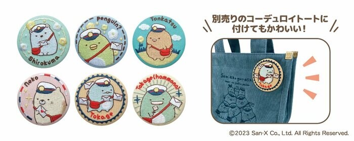 全6種類のうち何が当たるかはお楽しみの刺繍缶バッジです。ワンポイントとして、別売りの「コーデュロイトート」に付けて楽しむのもいいですね。