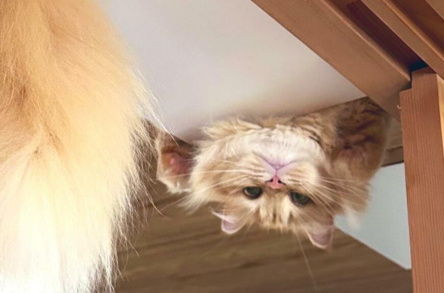 エマちゃんの様子を下から覗いた写真には、逆さまの姿勢でこちらを覗く姿がおさめられています。
