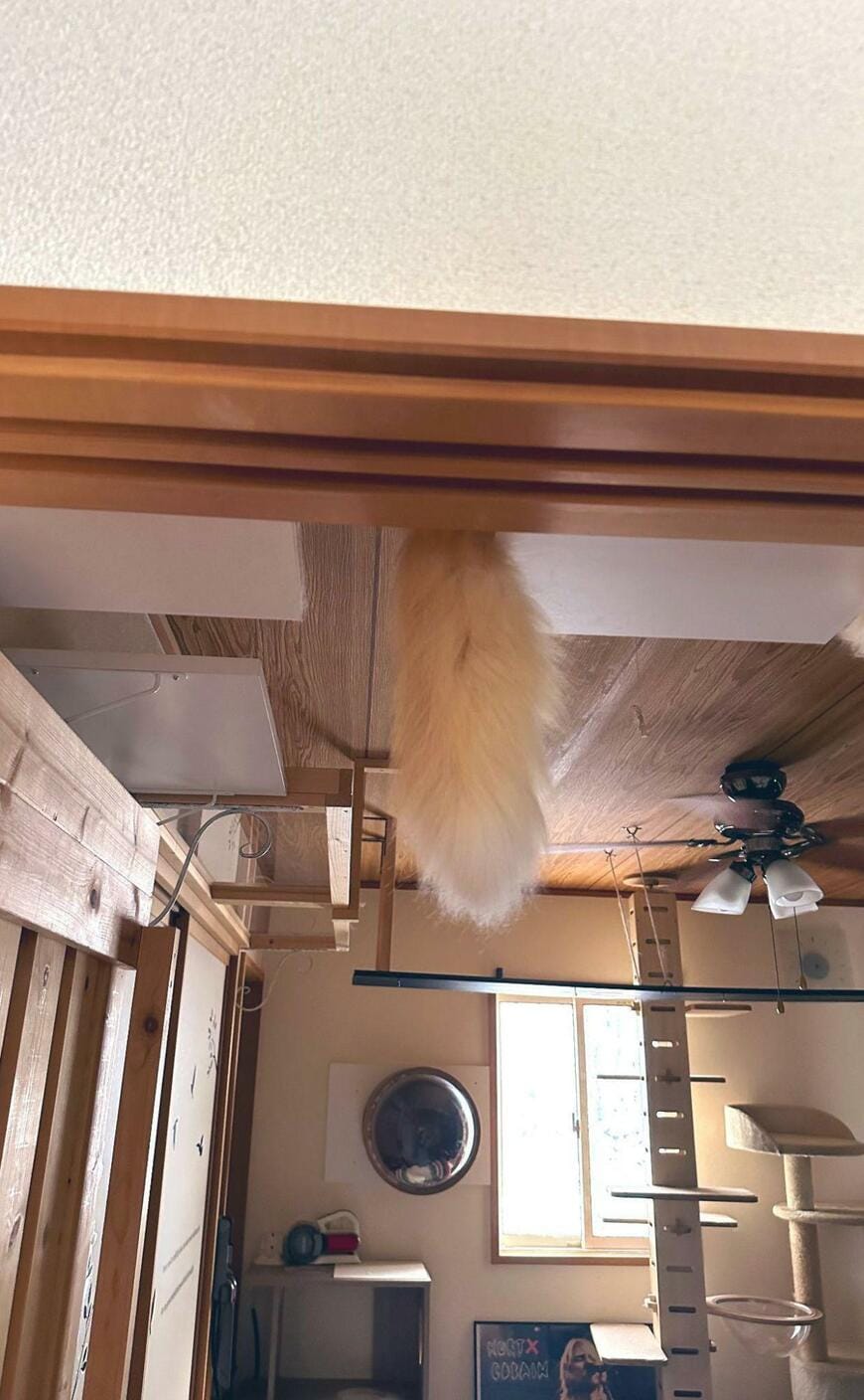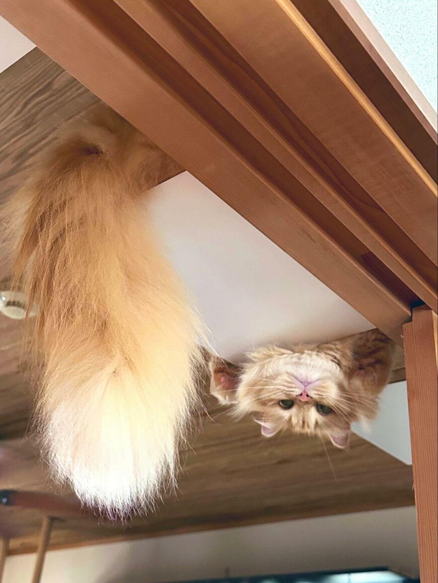 天井付近から垂れる猫ちゃんの尻尾。ほほえましいくつろぎ姿をとらえた写真がX(旧Twitter)で注目を集めています。