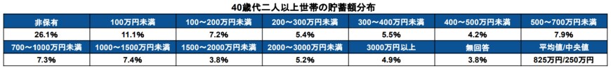 40歳代二人以上世帯の平均貯蓄額は825万円です。ただし、世帯によって貯蓄額の差は大きく、貯蓄が2000万円以上ある世帯が約10%ある一方で、貯蓄がない世帯も26.1%あります。