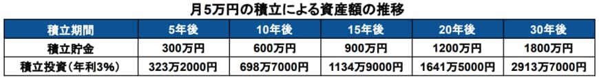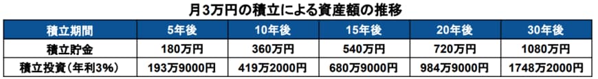 毎月3万円の積立預金と積立投資をした場合の将来の資産額