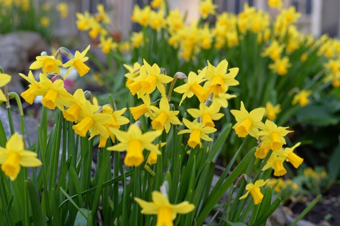 ミニスイセンは短い茎にパッと開く花がキュート。背丈が低くコンパクトにまとまるので、花壇の手前や寄せ植えに最適です。