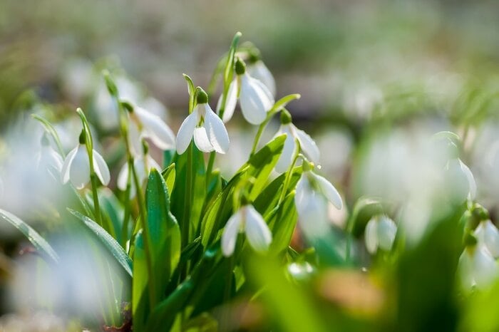 周りに雪が残っている寒い時期から花を咲かせるスノードロップ。真っ白でうつむきがちに咲く花が、まさに雪解けのしずくのようです。