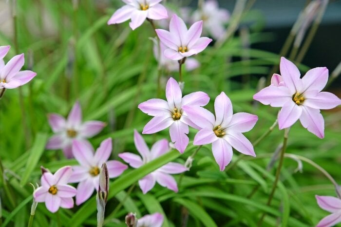 イフェイオンはブルーや白、ピンクの花が星形に開花。葉からニラのような香りがするので、「ハナニラ」という別名で呼ばれることも。