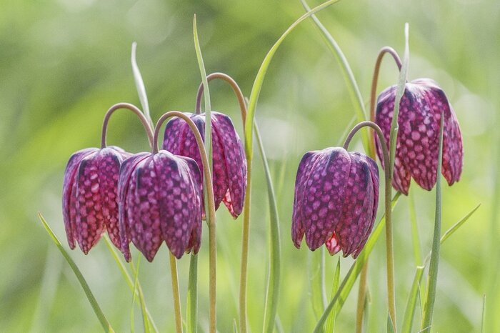 フリチラリアは品種が多く、カラーバリエーションも豊富。赤や褐色、網目模様のものなど個性的な色合いがそろっています。