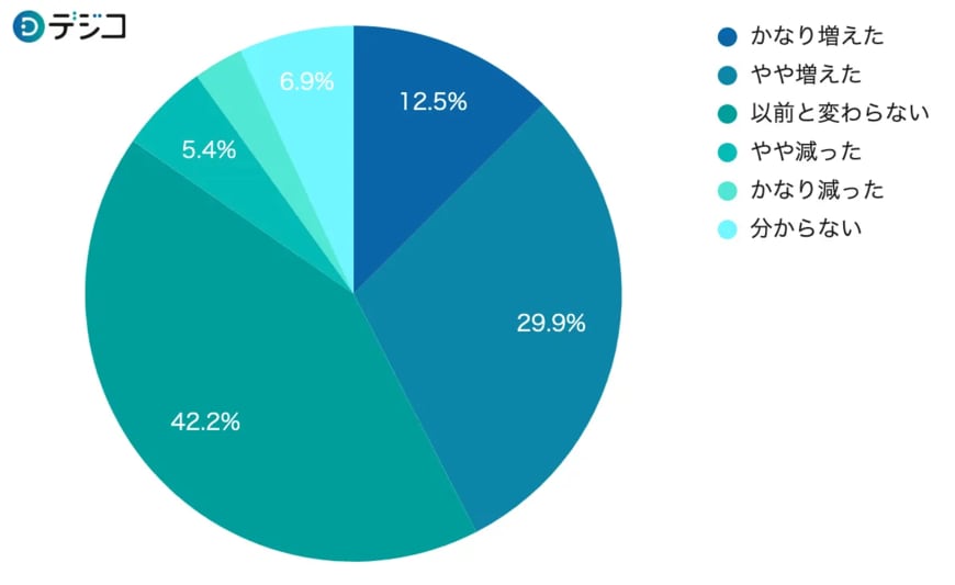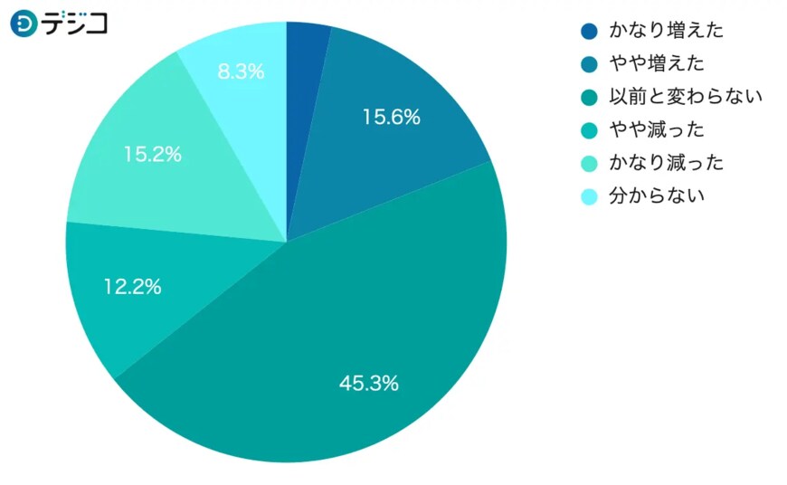 「増えた」と回答した割合が18.9%なのに対し、「減った」と回答した割合は27.4%です。なかでも、「かなり減った」と回答した割合は15.2%になりました。