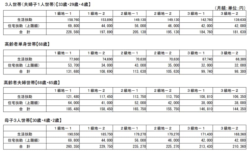 一般的なモデルケース別にみる級地ごとの最低生活費は、以下の一覧表の通りです。
