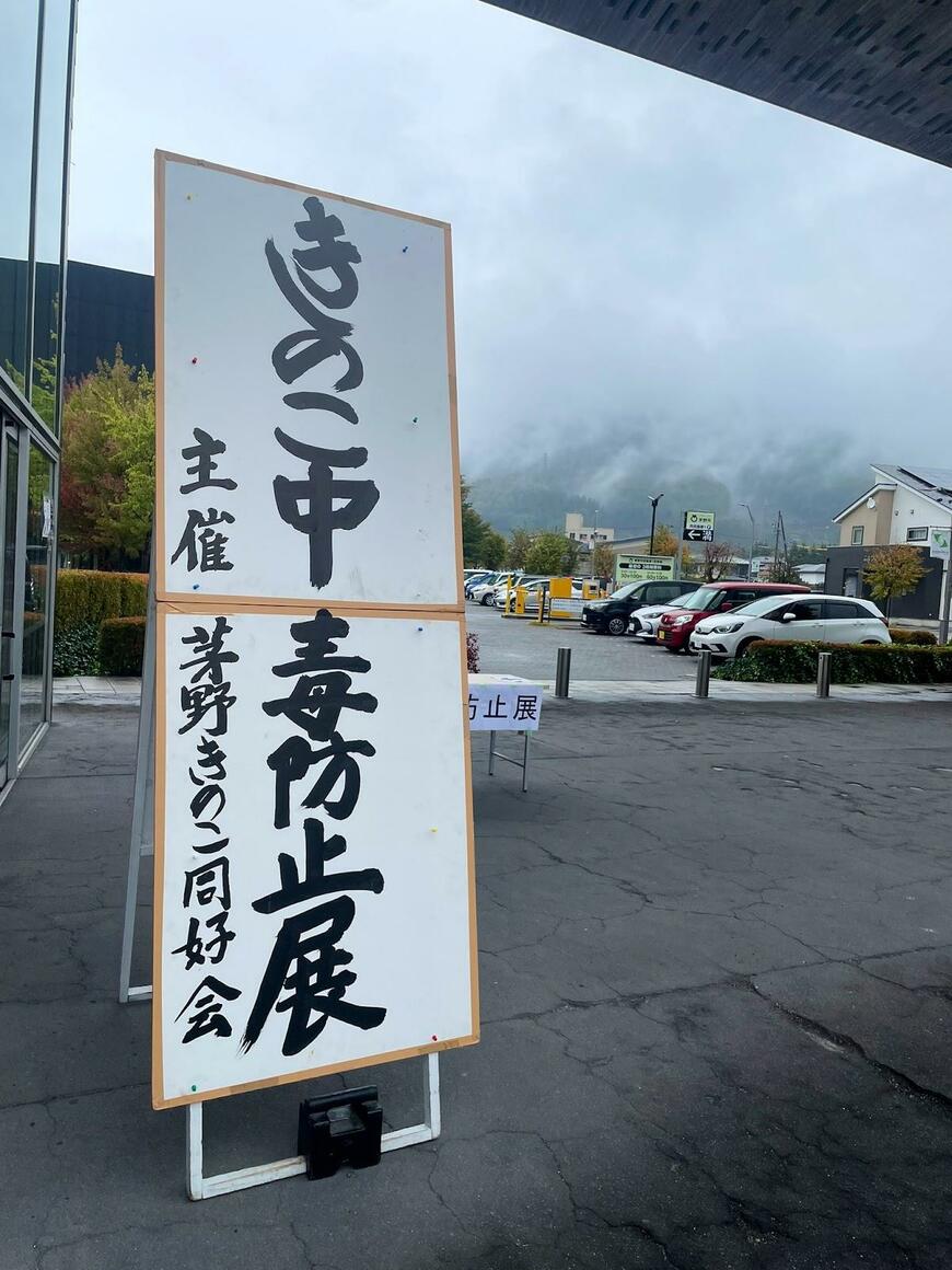 そこに収められていたのは、「きのこ中毒防止展」と書かれた看板。勢いのある手描きの文字や主催の「茅野きのこ同好会」など、看板だけですでに興味をそそられますね。