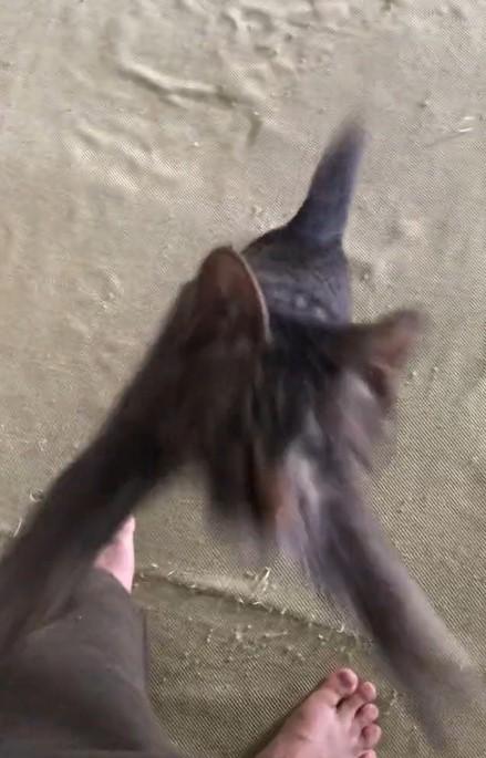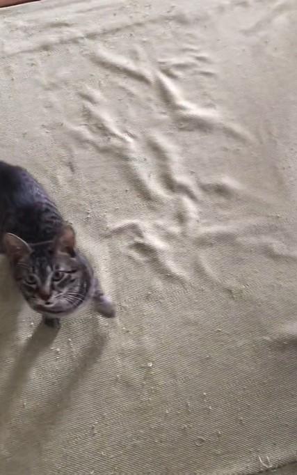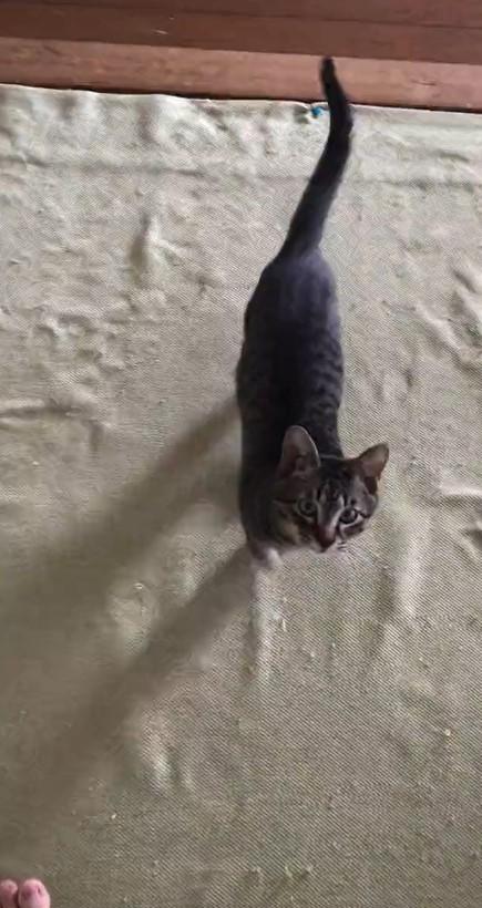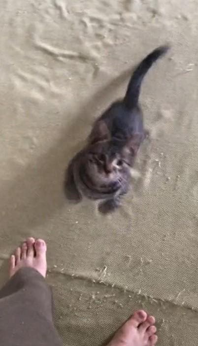 動画の冒頭には、立っている飼い主さんの前に座る1匹の猫「シイタケ」くんが写っています。シイタケくんは飼い主さんの前で、忙しそうにウロウロ。