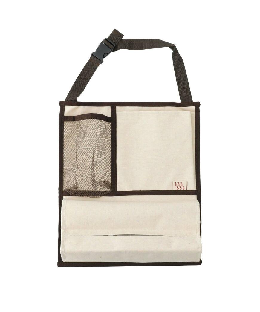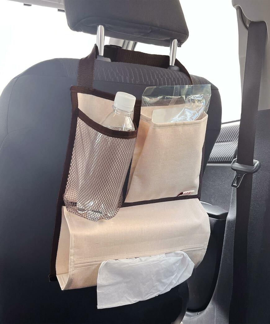 車のヘッドレストにベルトを通すだけで取り付けられる「バックシート収納」です。かさばりがちな箱ティッシュや500mlのペットボトルを収納することができます。