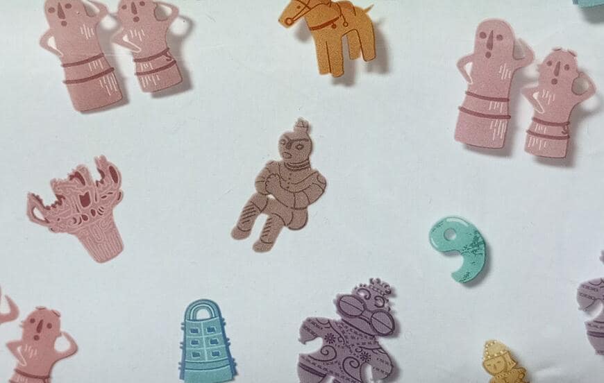 柄がわかりやすいように、無地の用紙を、内側に入れてみました。前方後円墳や銅鐸、土偶や埴輪、勾玉がデザインされています。