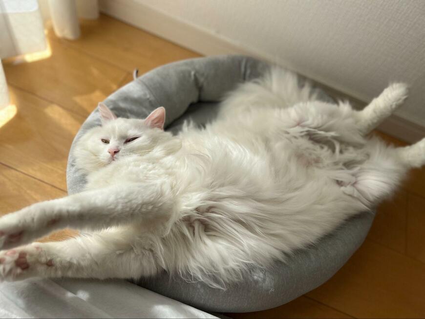 「ビヨーン」といった効果音が聞こえてきそうな、伸び伸びとしたポジショニング。そんなマオくんの姿からは、大きな安心感と幸せがあふれています。