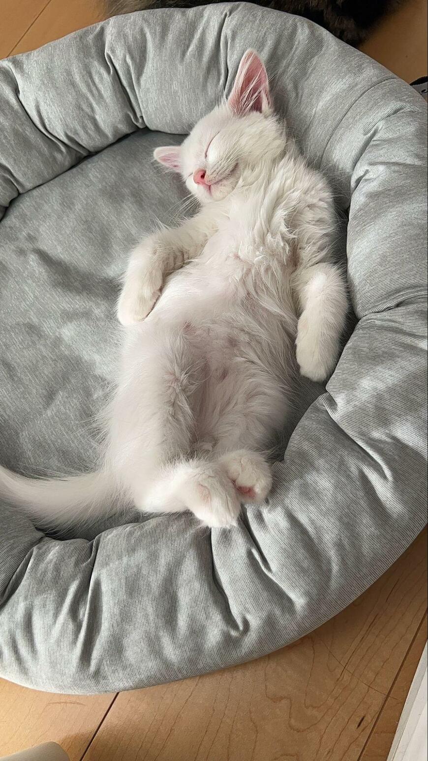 そして2枚目の写真を見てみると……?そこには同じクッションの上に横たわる、成長後のマオくんの姿がありました。