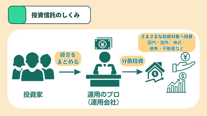 「投資信託(ファンド)」とは、一言でいえば「投資家から集めたお金をひとつの大きな資金としてまとめ、運用の専門家が株式や債券などに投資・運用する商品で、その運用成果が投資家それぞれの投資額に応じて分配される仕組みの金融商品」です。