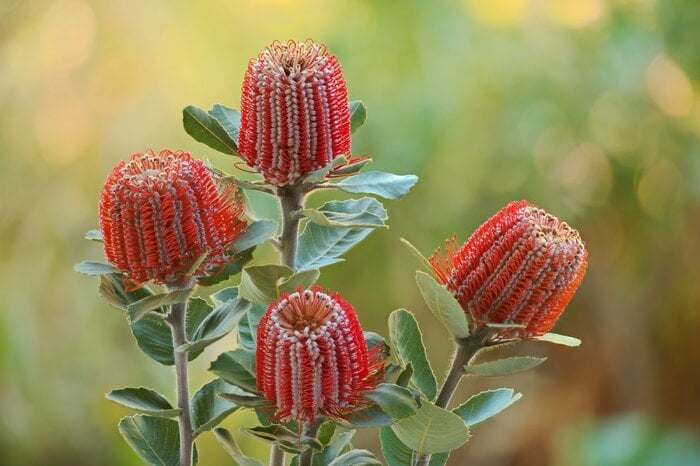 バンクシアは色鮮やかな円錐形の花がユニーク。コップを洗うブラシのようにも見え、存在感タップリです。