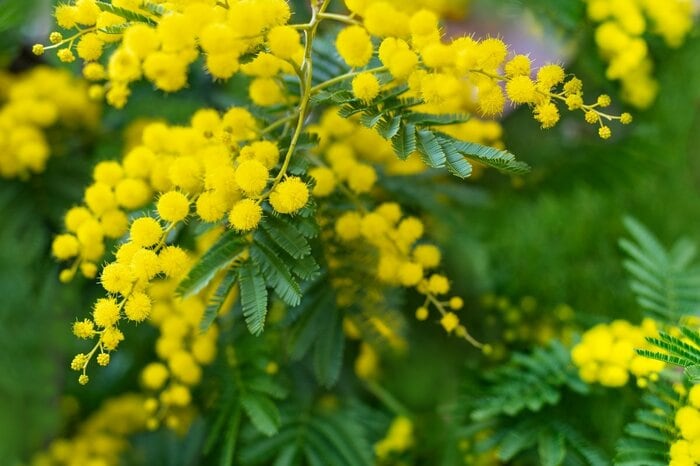 「ミモザ」という名前でなじみ深いアカシア。3~4月にかけてポンポンのような黄色の花を咲かせる人気の花木です。マメ科特有の細かい切れ込みが入る葉もキレイ。