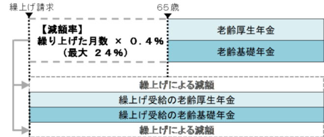 繰上げ受給は、年金を早くもらい始めるかわりに、繰上げ月数に応じた減額率(ひと月あたり0.4%)が適用されます。