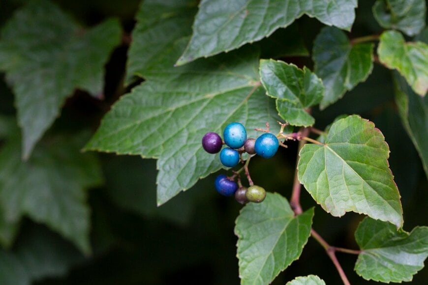 ノブドウはギザギザの葉がオシャレなツル性植物です。ブドウらしいツルを壁面やオベリスクなどに這わせて楽しみましょう。