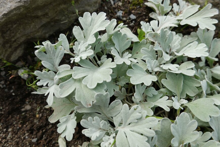 アルテミシア・モリスストレインはシロタエギクにも似たおしゃれなシルバーリーフ。しっかりとした葉は存在感があり、寄せ植えの主役をうまく引き立てます