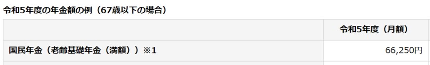 2023年4月の年金支給額をみると、満額で月額6万6250円でした(67歳以下の場合)。