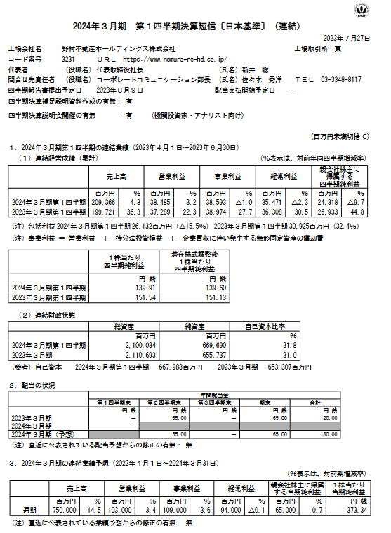 その結果、野村不動産ホールディングスの株価は2023年10月20日、前日比+0.27%の上昇となりました。