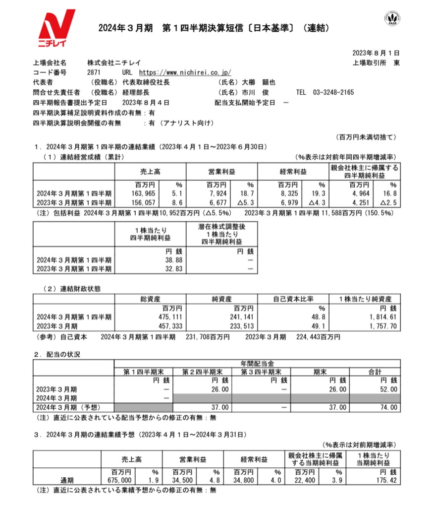 ニチレイ(2871)の株価は上昇。配当利回りは2.3%(2023年10月20日終値・株式取引概況)