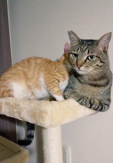 2匹は兄妹のような関係性で、甘えん坊な妹分のプリンちゃんは、面倒見がよいメロンくんにベッタリだといいます。1枚目の写真には、キャットタワーの上段でくつろぐ2匹の姿がありますね。