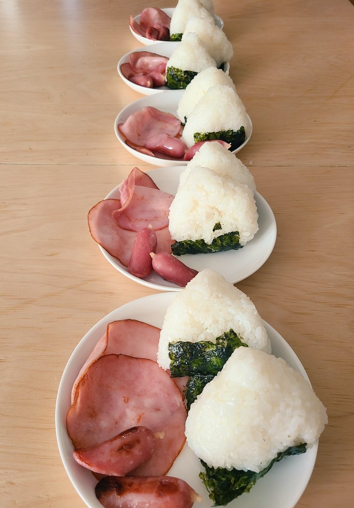 そこに収められているのは、テーブルの上に並べられた5皿分の朝食。2つのおにぎりの隣には、炒めたウインナーソーセージとハムが乗っていますね。